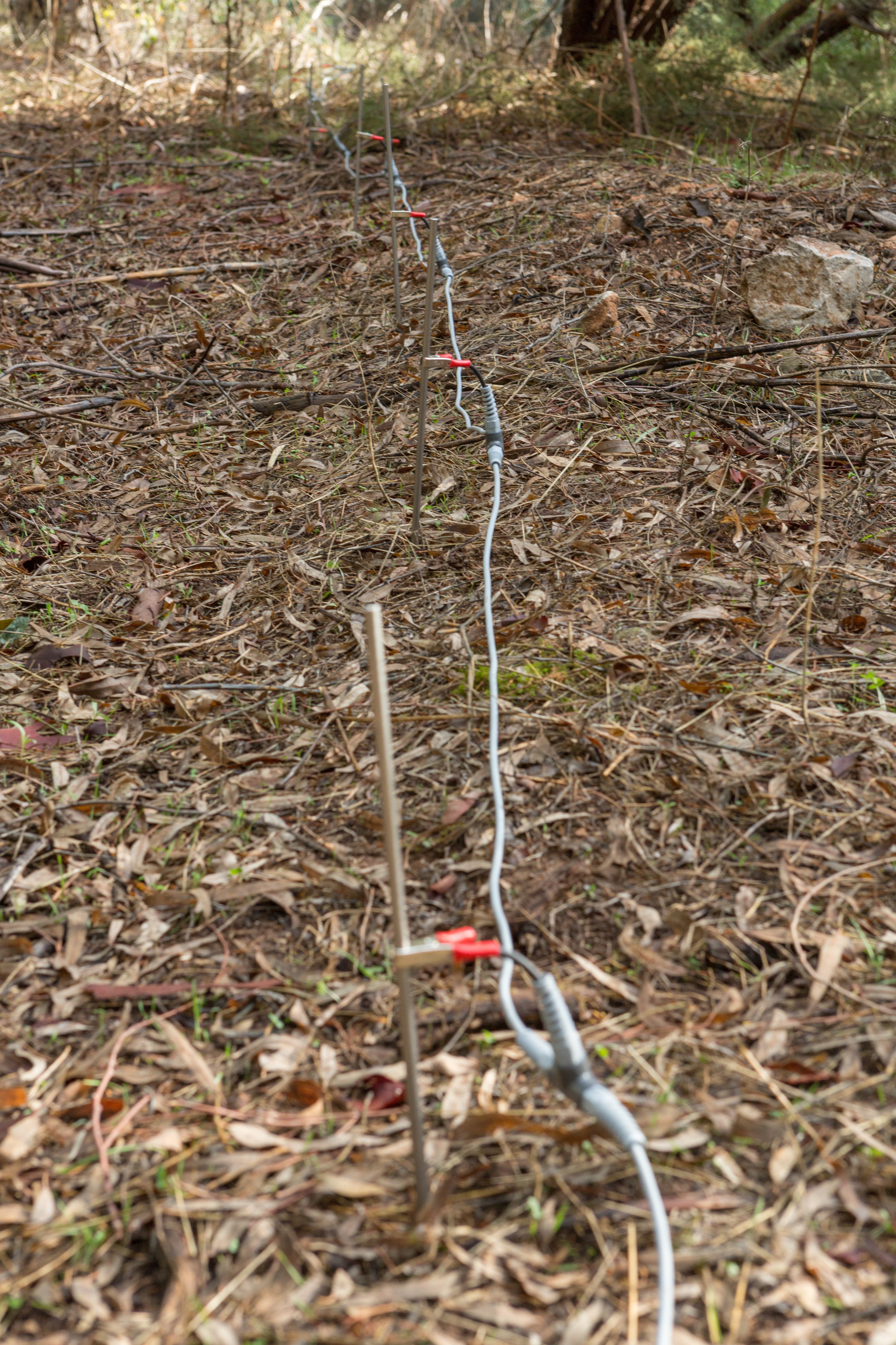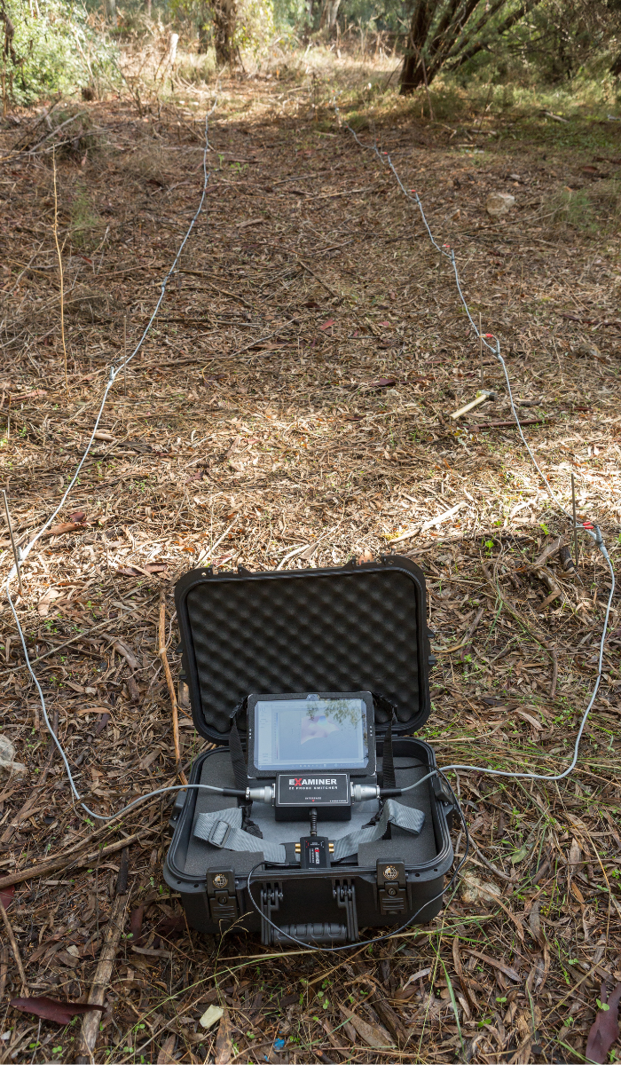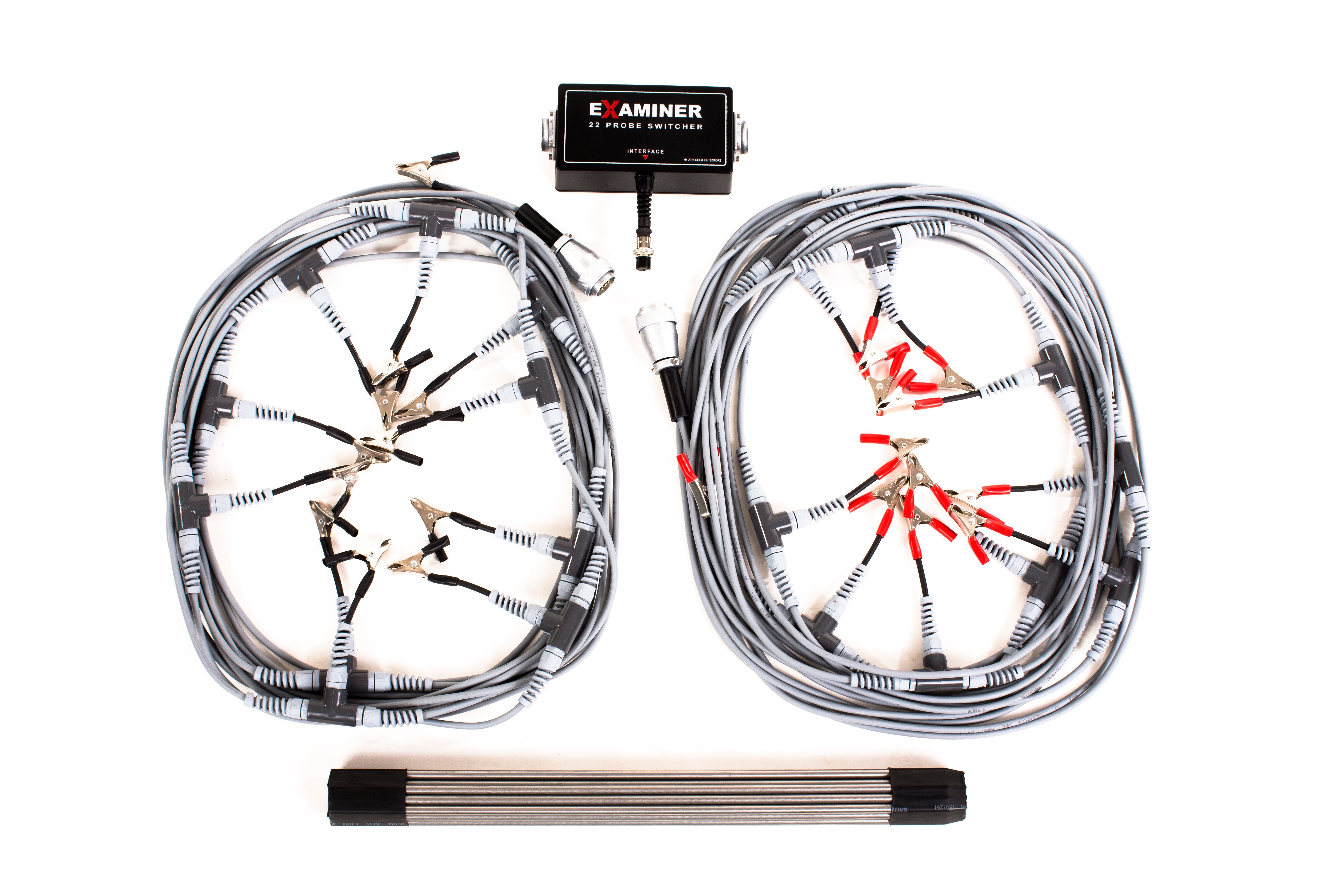To operate Geo Examiner 22 probes mode, it is necessary to acquire the accessory 22 probe system, module and 2 multi cables as shown. Select 22 PROBES, click START and Geo Examiner scans and visualizes automatically within 20 sec’s underground data from 11 probes on each of the 2 multi cables. The advantage of acquiring data from many scan points, increases the image resolution and speeds up the scan process. To compare, the 4 probe geophysical detectors require a lot more time for scanning the same area, and the scan image is not accurate. The ability of surveying using multi probes can be found to more expensive, bulky and complex 3D ground radar locators than the Geo Examiner.
